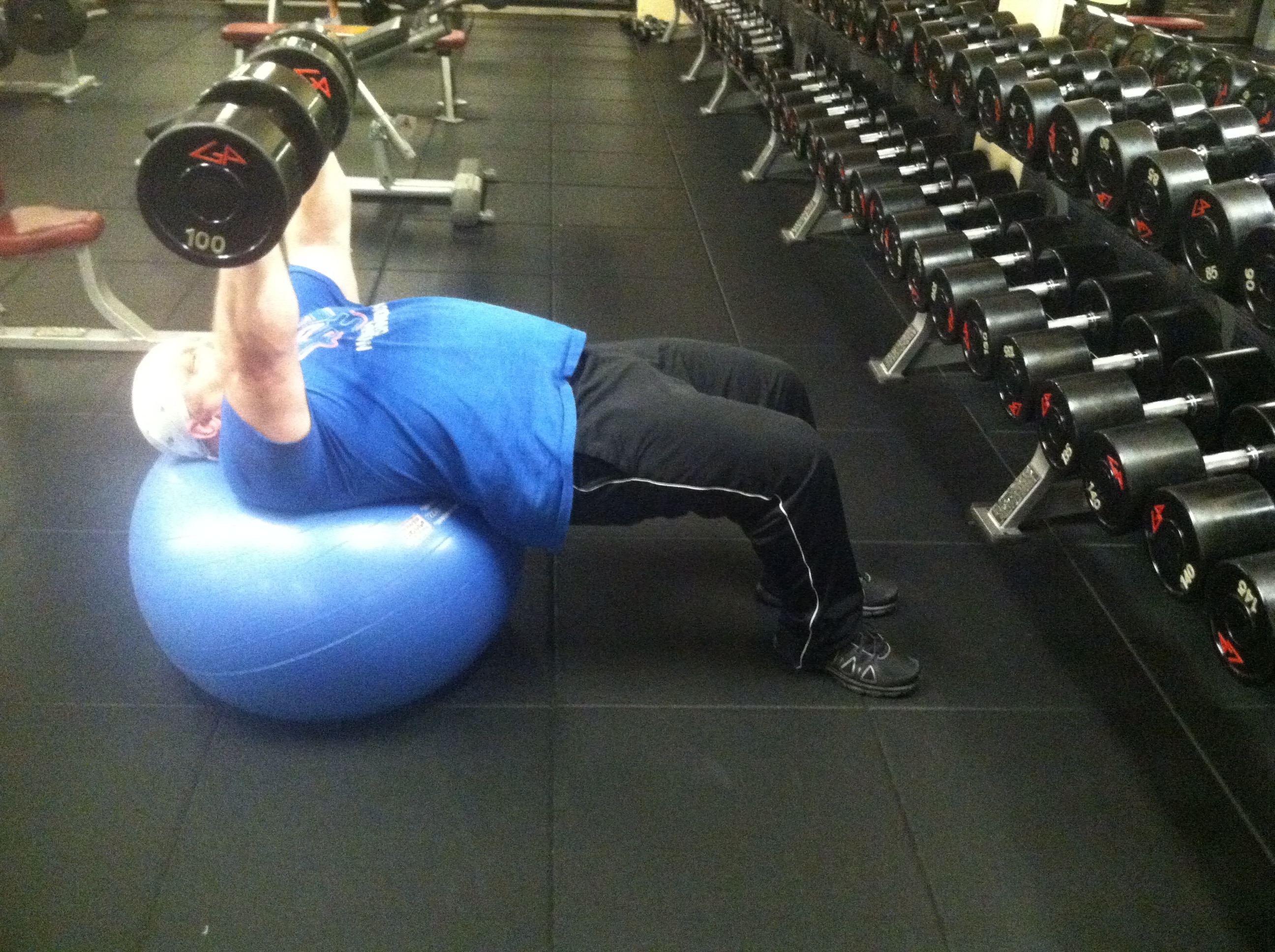 - When setting up, don’t let your shoulders and the dumbbells drift past the center of the ball as you bring them up. This will make it difficult to maintain your position on the ball (Don’t ask how I know this, but if your upper body and dumbbells outweigh your lower body, drifting past the center of the ball could flip you right over the ball leaving you lying face down flat on the floor wondering what just happened).